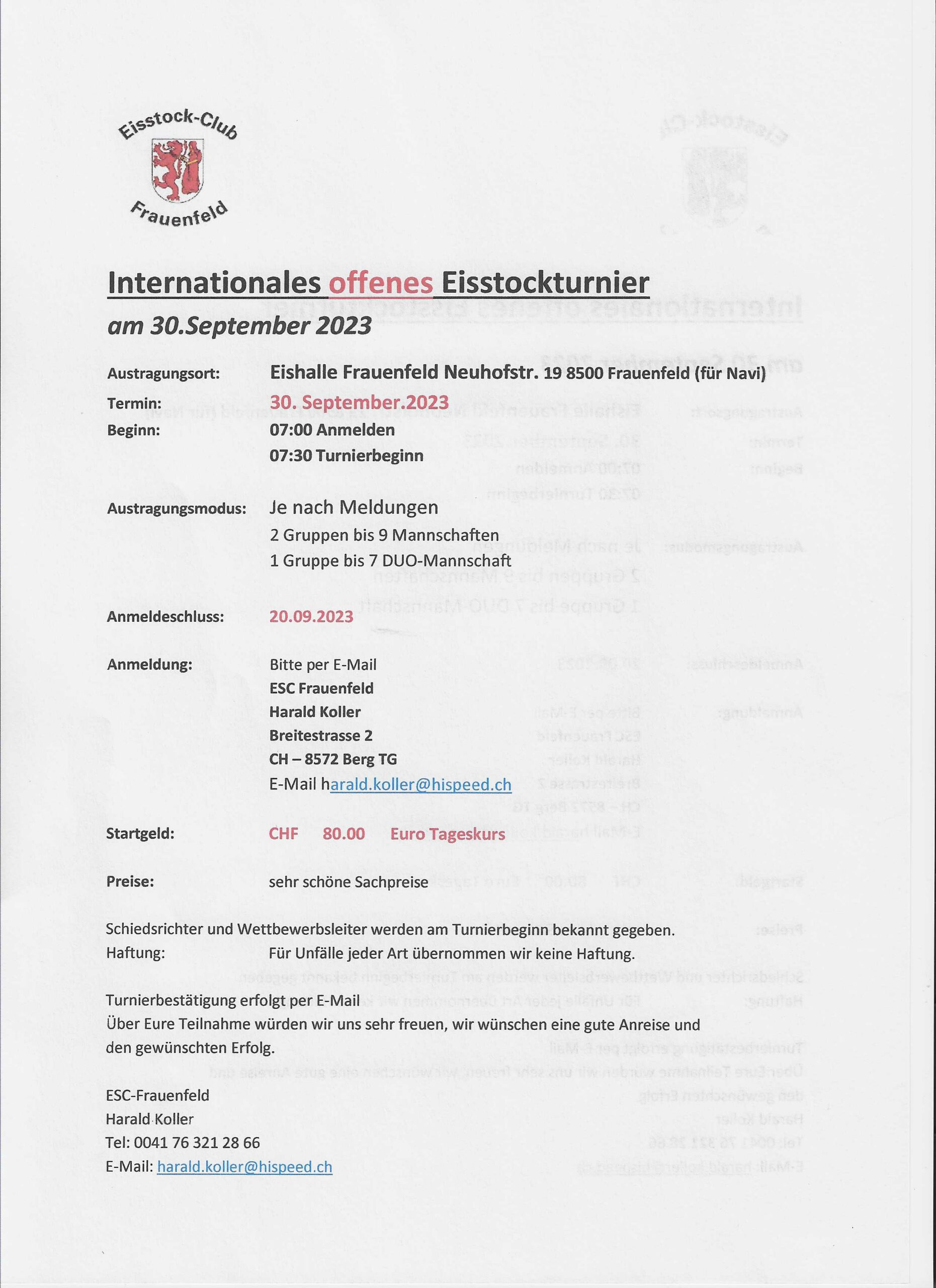 UncategorizedEinladung zum Eisturnier vom 30.09.2023 Veröffentlicht am 9. August 20239. August 2023 von Markus Abderhalden Wir freuen uns, Euch zu unserem traditionellen Eisturnier einzuladen. Es findet am Samstag, den 30. September 2023 statt. Näheres dazu in der Ausschreibung. Wir freuen uns auf Eure Anmeldung. Markus Abderhalden 7. Rang am Freundschaftsturnier in Aibl (A) Beginn Eistraining am Dienstag, 29. August 2023, 20:00 Uhr